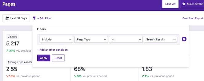 Add a condition like the one above that says the Page Type has to be Search Results. Then click the Apply button, and the dashboard will update to show you only search results pages.