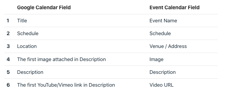 To reliably create and edit synced events in Google, use the table below. It shows how the 6 data fields from Google Calendar map to the Event Calendar fields during integration: