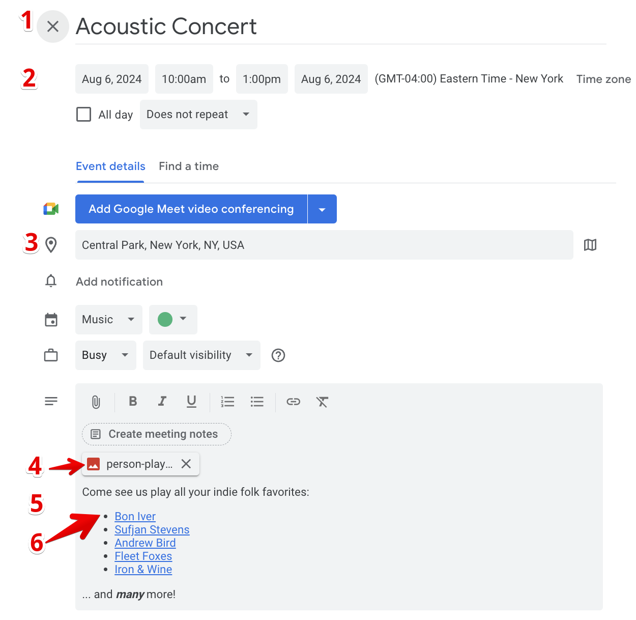 Understanding with a visual example is easier. Here are the 6 fields filled in a Google Calendar event: